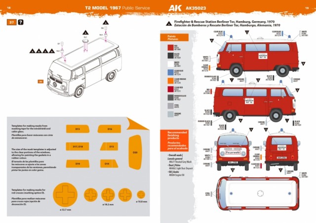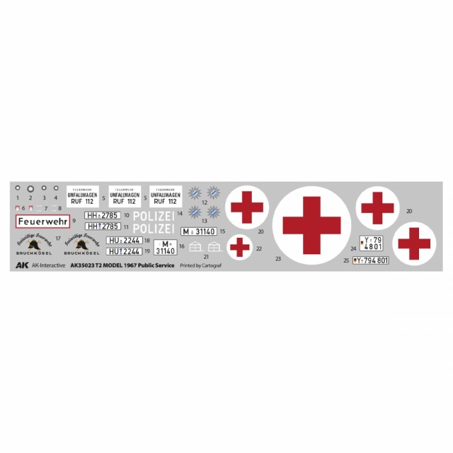 The reference AK35023 represents the bus version of the vehicle manufactured in Germany from 1967 until 1971, probably one of the most popular variants in use. Includes two variants of emergency lights and a roof-mounted ventilation fan. The decal sheet contains markings for one Bundeswehr, one police and two firefighter vehicles.