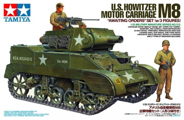★1/35 scale plastic assembly kit of the U.S. Howitzer Motor Carriage M8 with 3 figures. ★Open top turret, howitzer, and overall form reproduced in rich detail. ★Accurately depicted suspension mechanisms. ★Commander, gunner, and loader figures included to enable creation of a simple diorama straight from the box. ★Comes with 3 types of markings.