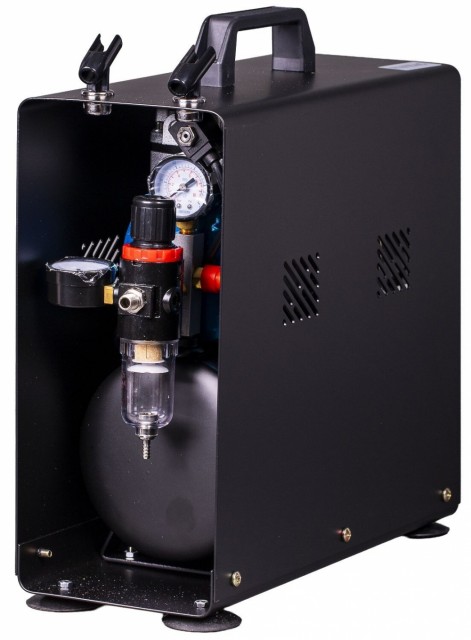 Panzag AS196AW er en stillegående og meget kraftig airbrushkompressor med ståldeksel. Den har to sylindere (olje og vedlikeholdsfri) og en stor tank på 3,5L som sikrer ren og stabil luftstrøm.