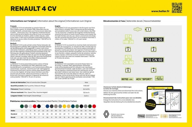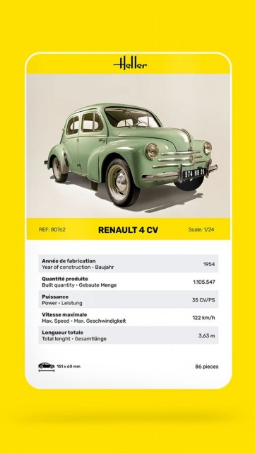 The Renault 4CV (other names: Renault 4/4 or Quintette) is a French passenger car that was first presented to the public in 1946. Its serial production started in 1947 and lasted until 1961. About 1.1 million copies of this model were produced during it. Production took place in several cities, but the most important plants producing this model were in Billancourt, France.