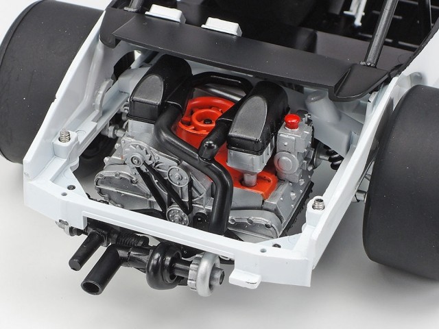 • The horizontally opposed 6-cylinder DOHC engine and interior are authentically recreated. Removable engine hood reveals a view of engine components even after assembly.