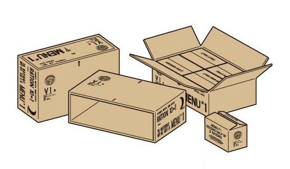 These are detailed depictions of WWII 10-in-1 ration cartons. The 10-in-1 Ration was supplied to U.S. troops from 1943 to 1945. One sleeved carton contained four individual boxes, each contained a day’s rations for ten soldiers and included canned food, biscuits, cereal and more.