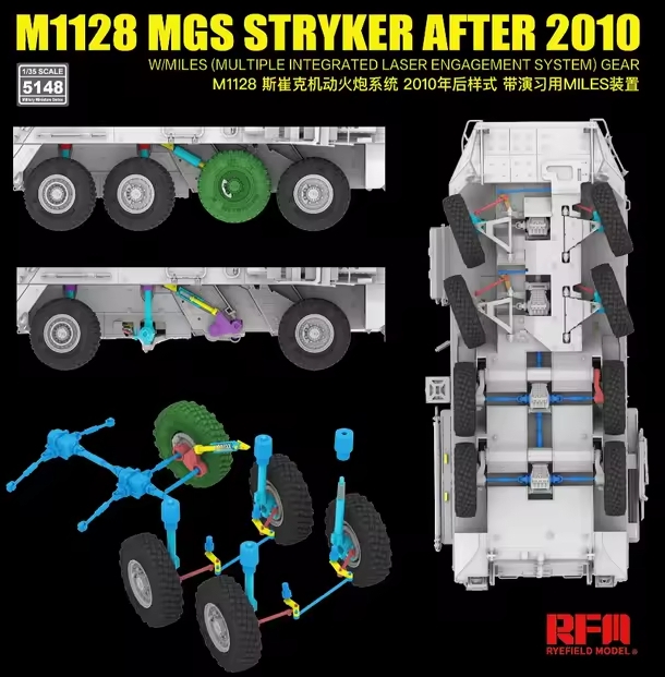 Plastic model kit for building a U.S. M1128 Mobile Gun System (MGS) in post-2010 configuration with MILES equipment