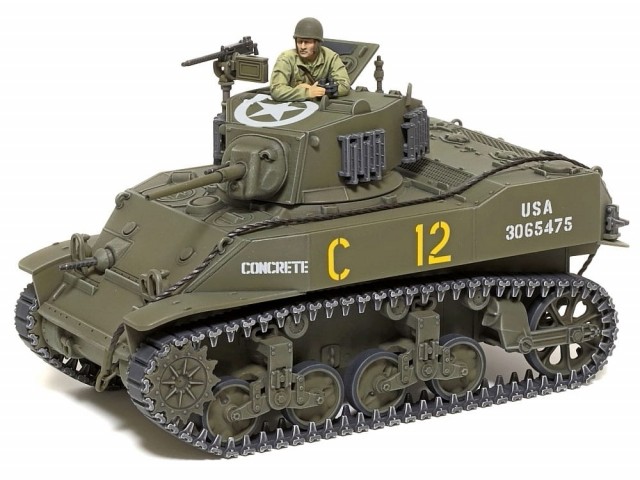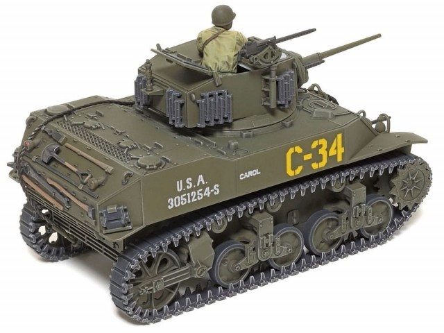 This assembly kit recreates the U.S. Light Tank M5A1 Stuart in compact 1/48 scale! The light tank M5A1 was developed as the successor of the M3 Stuart, which was America’s first major mass production light tank. Powered by twin V8 gasoline engines, it achieved speeds of up to 58km/h. While it kept the M3 turret, the M5 had a welded hull with updates to the sloped frontal armor and the rear engine deck. After that, M5A1 tanks appeared with an updated turret equipped with a 37mm gun, and they had bigger hatches, rails for track grousers and a 7.62mm machine gun mount. Around 6,800 M5A1s were produced, and after debuting in North Africa they were deployed on the new Italian and Western Fronts from 1943 and 1944 respectively, using their mobility effectively in reconnaissance and other roles.