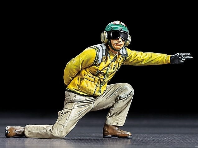 The F-14 Tomcat is a legend of the skies, which served between 1973 and 2006 and - with powerful radar and long-range missiles - was developed for carrier-based units. Its most prolifically produced variant was the F-14A, which itself was given a number of upgrades throughout its production; late F-14As (those produced from the late 1980s) featured a more reliable engine design, and notably, the AN/AXX-1 TCS camera pod, plus the AN/ALQ-126 ECM antenna ahead of the wing gloves. Some even had alterations to the fuselage allowing installation of the TARPS reconnaissance pod. From the early 1990s, the aircraft was capable of mounting bombs on its belly; in conjunction with the AN/AAQ-25 LANTIRN pod, these were laser-guided - the F-14A had evolved into a multi-role fighter. Carrier launches required a steam catapult, to which the aircraft would be harnessed with its nose lowered, variable sweep wing forward, and flaps and slats down. Numerous flight deck crew would be engaged in the launch, including a "Shooter," who gave the signal for take-off.