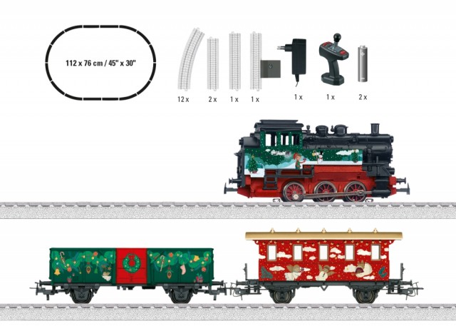 Model: The locomotive has an mfx digital decoder and front light. 1 axle powered. Traction tires. The locomotive has coupler hooks. All the cars include RELEX couplers. Train length approximately 33.3 cm / 13-1/8". Contents: 12 each R1 curved track, 2 each 171.2 mm / 6-3/4" straight track, 1 each 188.3 / 7-13/32" straight track, and 1 base station. All the track is white with a glitter effect. There is a cut-out sheet of "Christmas Gifts". The set has a switched mode power pack and a wireless, easy to use infrared controller, the Märklin Power Control Stick. 2 AAA batteries are included with the set. This set can be expanded with the 20124 "Snow-Covered Track" C Track extension set.